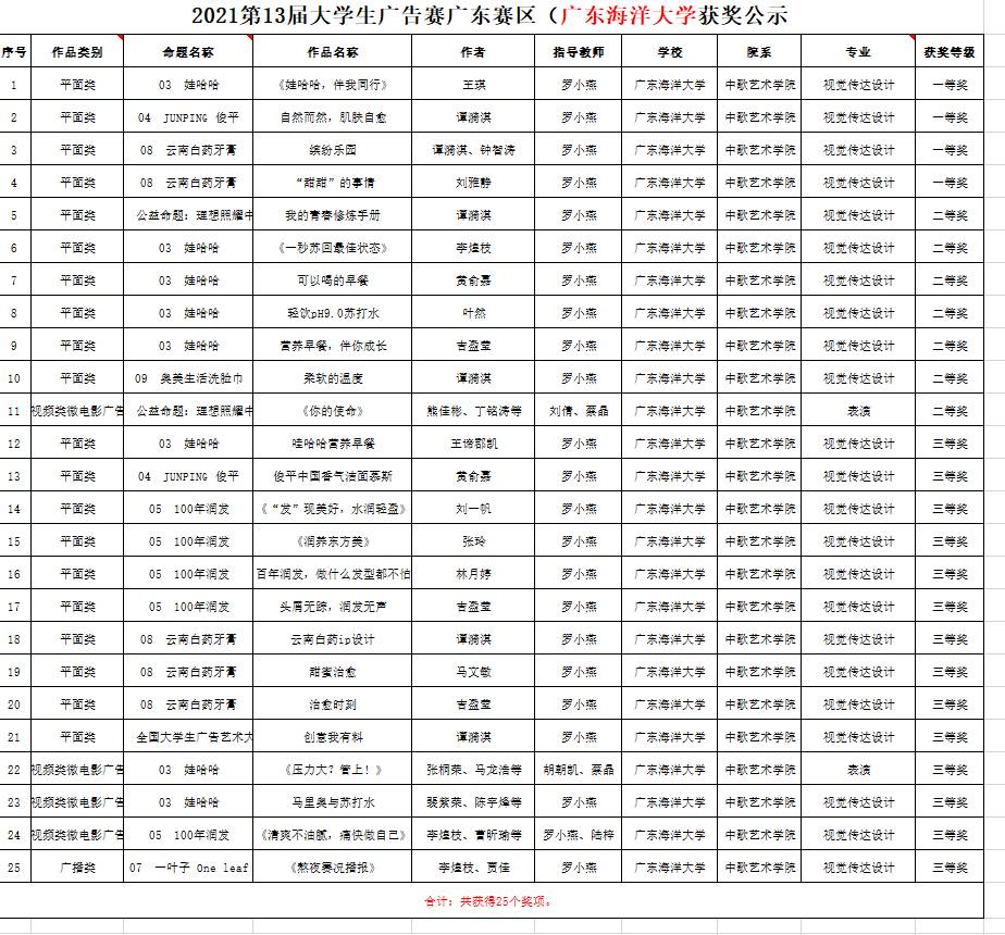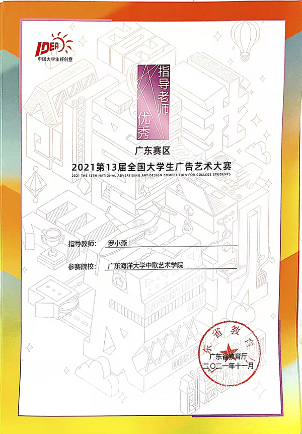 近日,公司taptap点点学子在由教育部高等教育司指导,中国高等教育学会、教育部高等公司新闻传播学类专业教学指导委员会共同主办的第十三届全国老员工广告艺术大赛(广东赛区)上取得优异成绩,斩获大赛25个奖项。其中一等奖4项,二等奖7项,三等奖14项,罗小燕老师获广东省教育厅颁发的“优秀指导教师”奖。